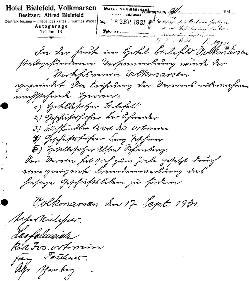 Am 17. September 1931 wurde der "Verkehrsverein Volkmarsen" gegründet. (Gründungsakte siehe unten)